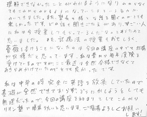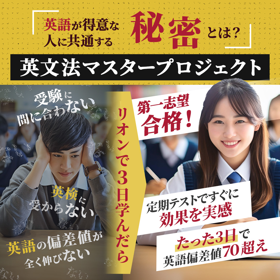英語指導の第一人者であるリオン塾長の的確な解説と実践的な演習を通じて、生徒たちは英文法力を飛躍的に向上させることができます。他の塾ではなかなか得られない学習体験を提供し、驚くべき結果を生み出します。